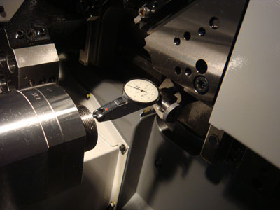 10、背面鉆孔刀架與背軸同心度: 把千分表裝在專用的檢具上,觸頭接觸刀架孔內(nèi)的檢棒,旋轉(zhuǎn)表頭,觀察千分表指針數(shù)據(jù). 加工影響:刀具(鉆頭)壽命,偏孔,擴孔